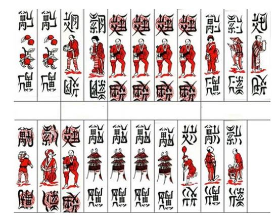 Cạnh đó, còn có vài chữ khác có gốc từ tổ tôm ra như chữ cửu vạn, hay con 9 Vạn, vốn có hình một ông đang khiêng đồ, cho nên người ta gọi những người làm nghề bốc vác là cửu vạn.